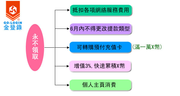 1.优先抵扣X-POS的各项网络服务费用(此类可加值3%抵扣). 2.选择此类服务者,自选择日起6个月内不得中途变更提款类型. 3.只要额满一万X币以上部份皆可以转购X-POS预付充值卡. 4.我们建议您最好在半年内选择永不领取。因为您要是没有把握半年内赚取足够的X币,可以利用增值3%的优势,更快速累积您的X币. 5.我们建议您应该多去使用X币只要使用在浏览别人的个人主页与对方交流,当然刚开始您会觉得不划算,因为您每次收藏别人的个人主页一次,您必须花掉一个X币,可是相对的没有付出是没有收获的。如果您精心设计您的个人主页,相对地别人也会将您的个人主页收藏起来,您也会赚回来您的X币的. |