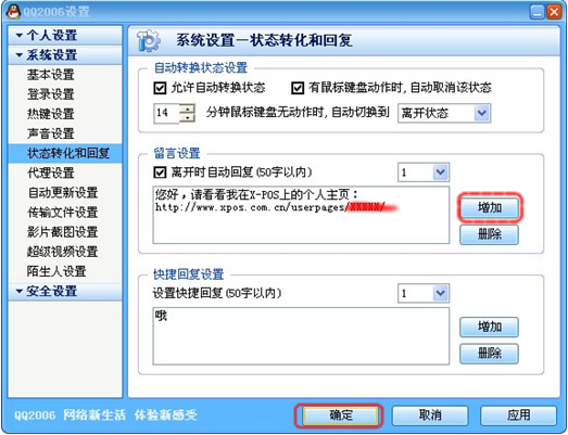 | 3.单击后,直接跳出“系统设置-状态转化和回复”页面:在“留言设置”的编辑框里,输入包含XPOS个人主页地址的内容(可随意设置),编辑完成后点击“增加”,然后点击“确定”完成。 |