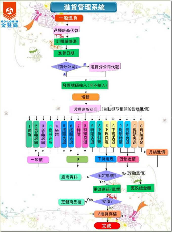 进货单输入系统是针对不须经由采购流程就直接输入进货单的作业管理,是对于像是超市裡的日配商品类、报纸类、生鲜蔬果类等等,都是不需要经过采购流程式控制管的,就需要直接输入进货资料,适用于公司规模不大的小企业。流程图如下: