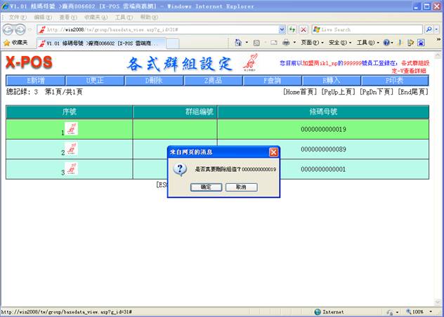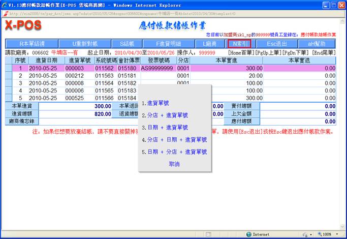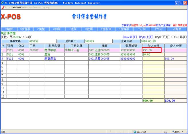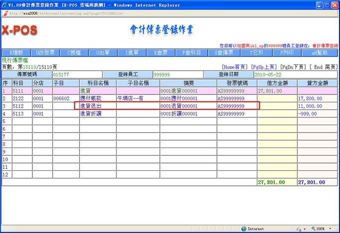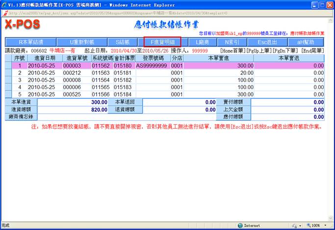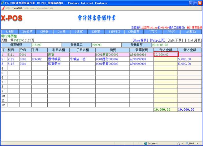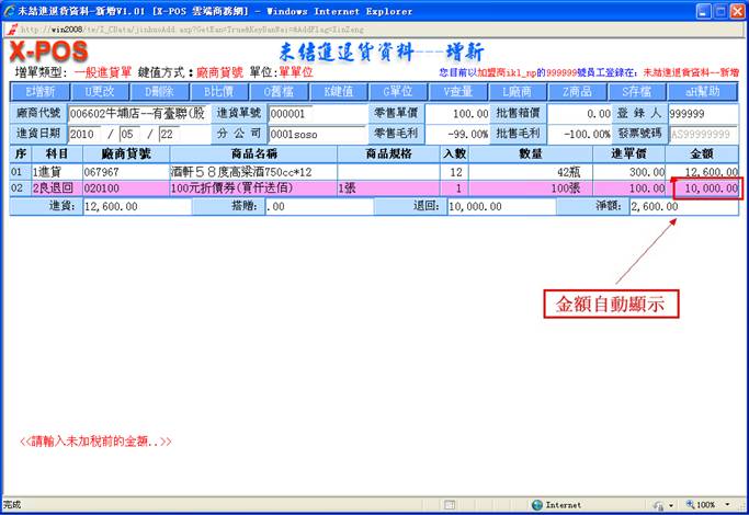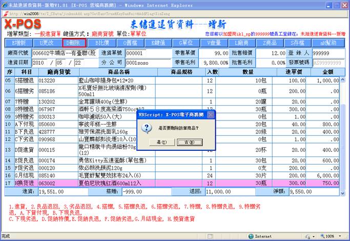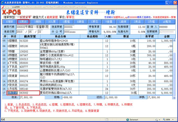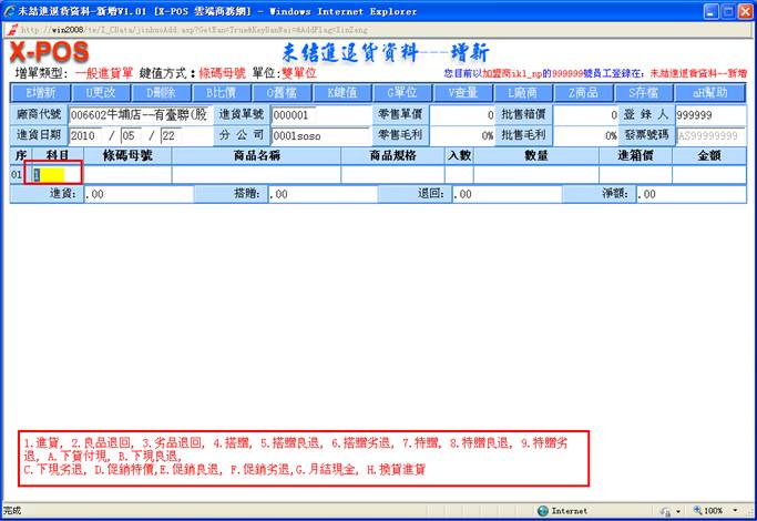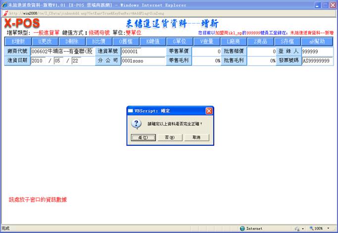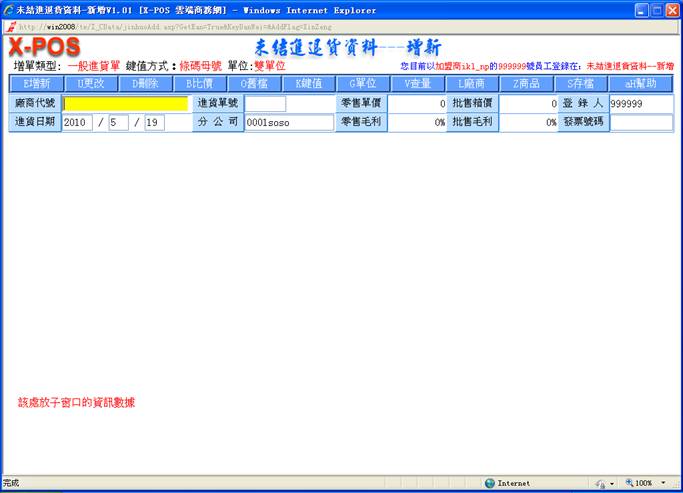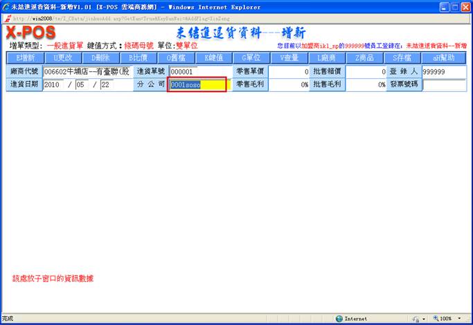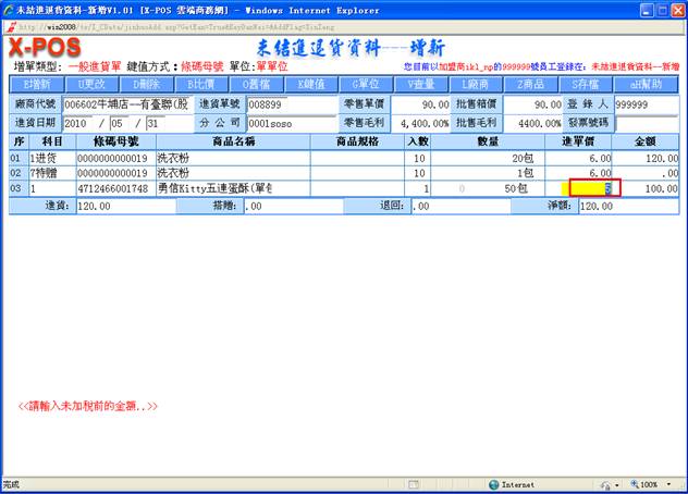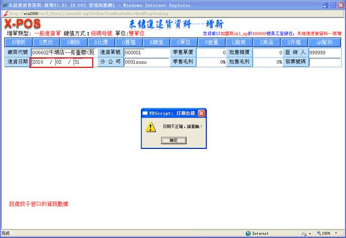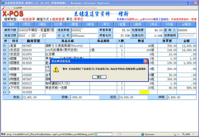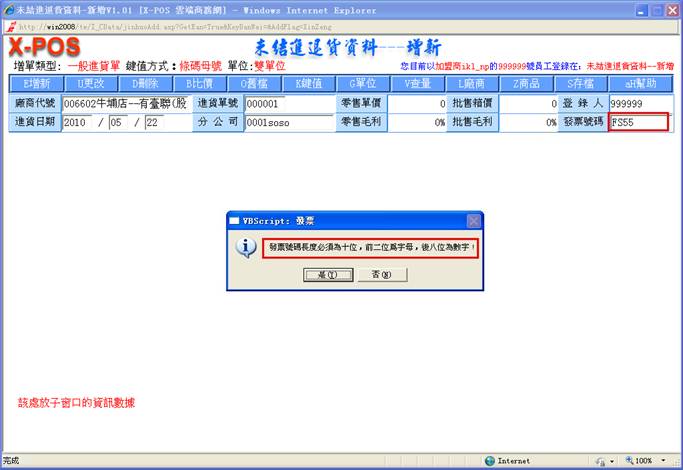 2-F 发票号码:针对该进货单内容的相对发票号码,本项可以连结到发票管理系统,也就是以发票号码可以连结查询到相对的进货资料内容,只是因为进货系统是配合印表纸张大小,采用的是11吋的连续报表纸中一刀(半张)的格式,所以进货资料只可以输入最多15笔的内容,万一厂商使用的电子发票是超过15笔的话,在本系统是必须分割为二张以上的进货单资料,因此可能导致不同的进货单内容但是却有相对一样的发票号码内容情况发生。前两位元为字母,后八位元为数字,如果输入不正确,就会弹出提示框,按
