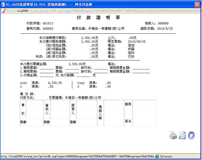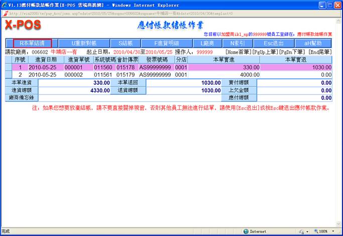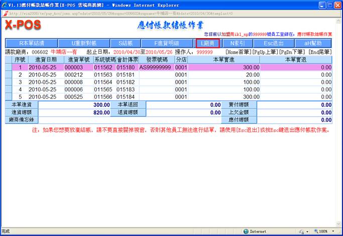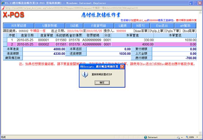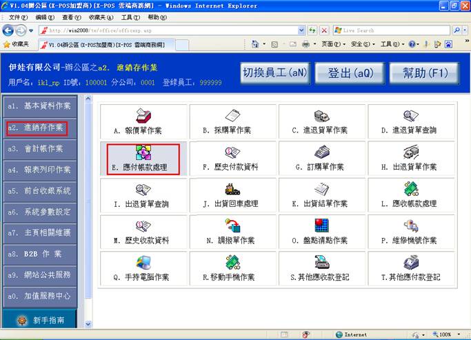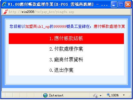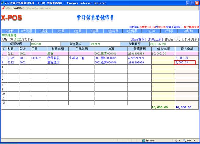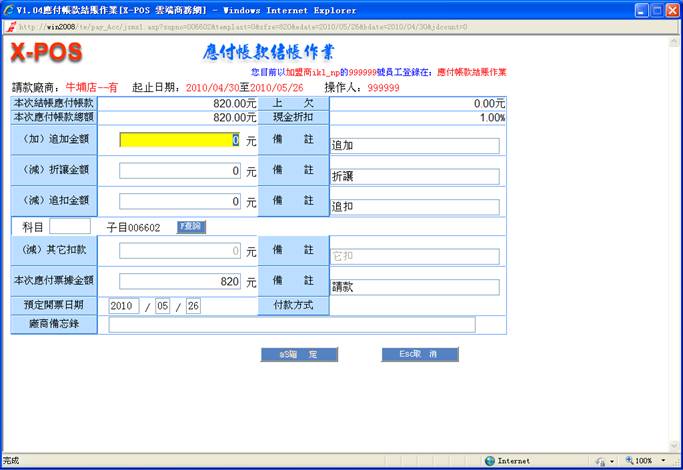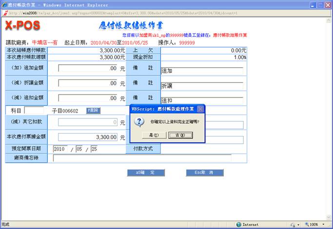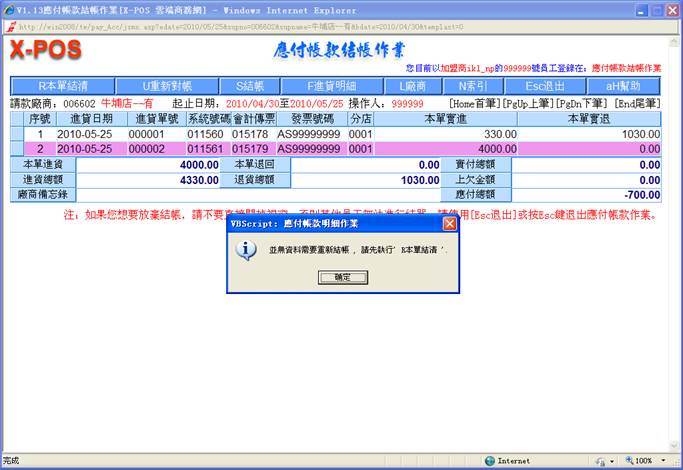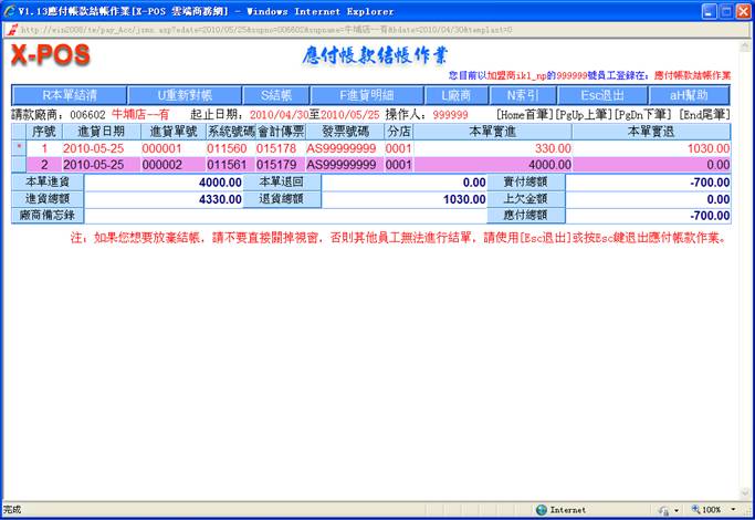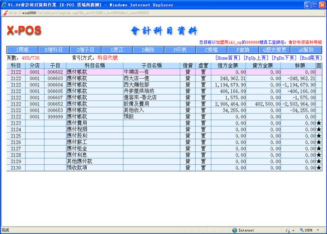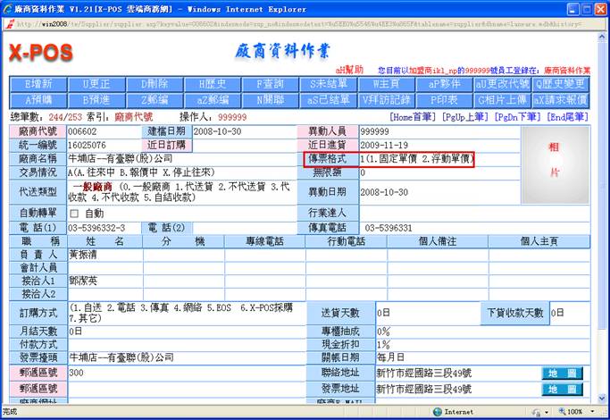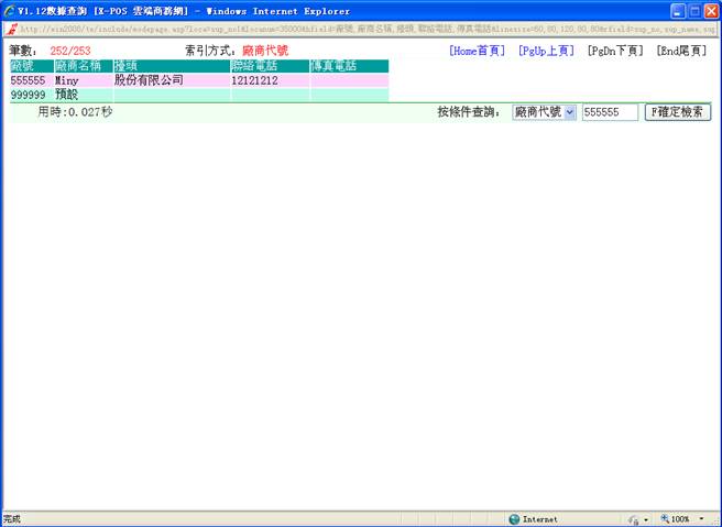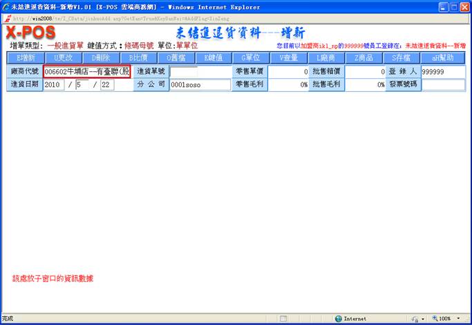 键后,若输入代号不足六位时,系统会在前面自动补零足6位,若您输入的厂商代号存在资料并且交易情况为[A.往来中]时,系统自动读取出与该厂商代号相对应之厂商名称: