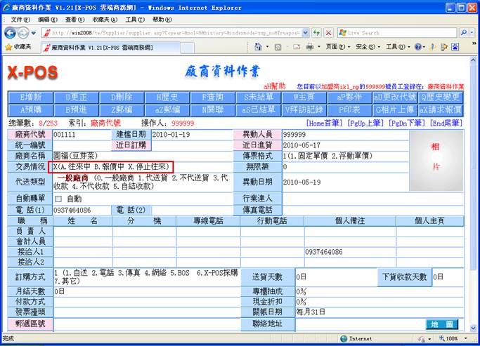 若该厂商代号不存在,或该厂商资料中的交易情况设定为[X停止往来]时,如输入:001111的厂商代号时,交易情况为=X,表示本厂商已经停止往来。