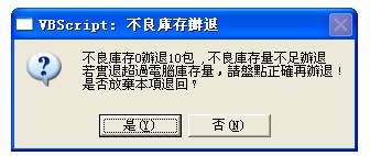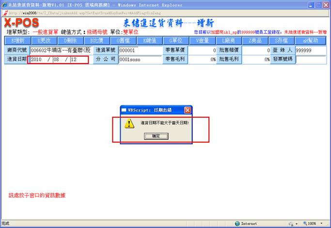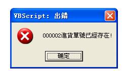2-B 进货单号:可以输入厂商的出货单号码内容,如此方便厂商的出货单内容与自己方的进货单内容近似,当万一单据内容有问题需要以厂商的出货单找寻自己方进货单时,双方可以更容易沟通找寻出来。输入的进货单号为6位数字,若不足6位数字时前面将自动补零,同一家厂商代号的进货单号不能重复,若有重复输入,则会弹出警告: