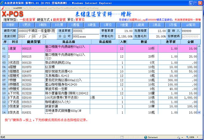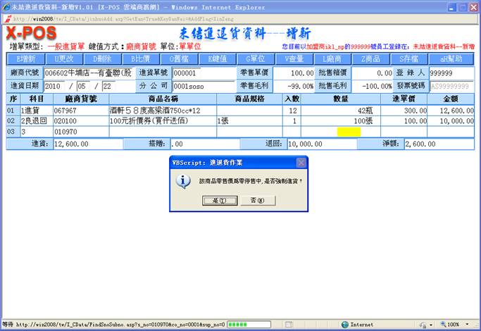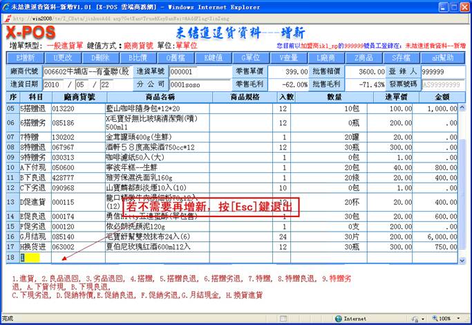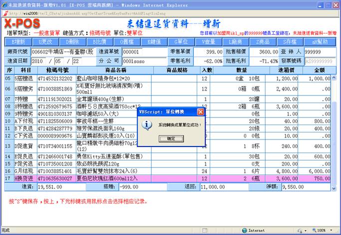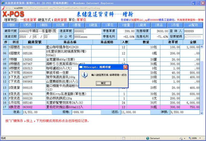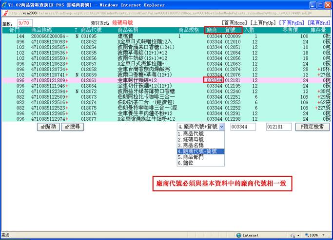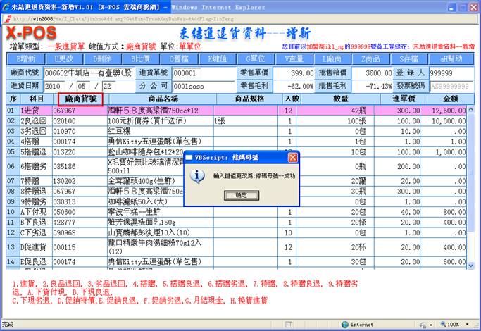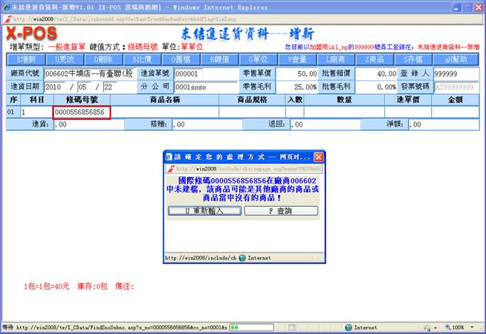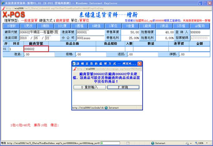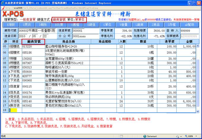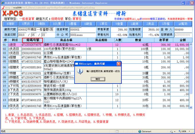 系统会去找出该商品母号相同条码的所有商品出来,再去比对其中是不是有本[厂商代号]的商品存在,存在的话就直接抓取该商品资料的相关内容转入进货作业中继续操作;但是万一一样的条码商品又建立有指定的厂商代号商品,可是该厂商代号的商品可能有一个以上时,系统并不会要求操作者选择使用哪一个厂商货号的商品,只是给于第一个找到的厂商代号的商品继续操作,因此有同样的条码商品又同一个厂商代号,但是必须建立二个不同厂商货号的商品资料这样的情况,那进货作业时就应该切换使用厂商货号的输入方式,直接指定输入该厂商货号商品即可。