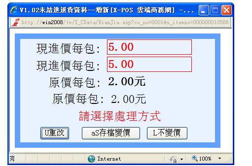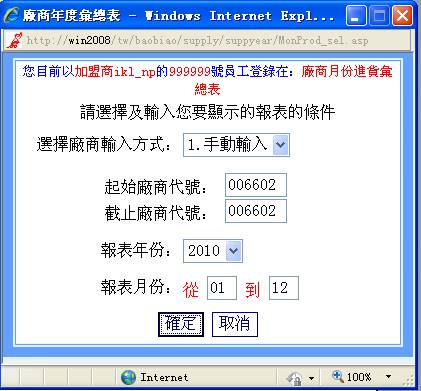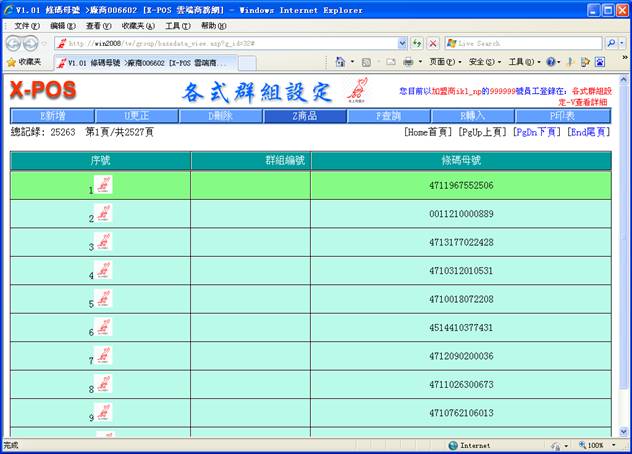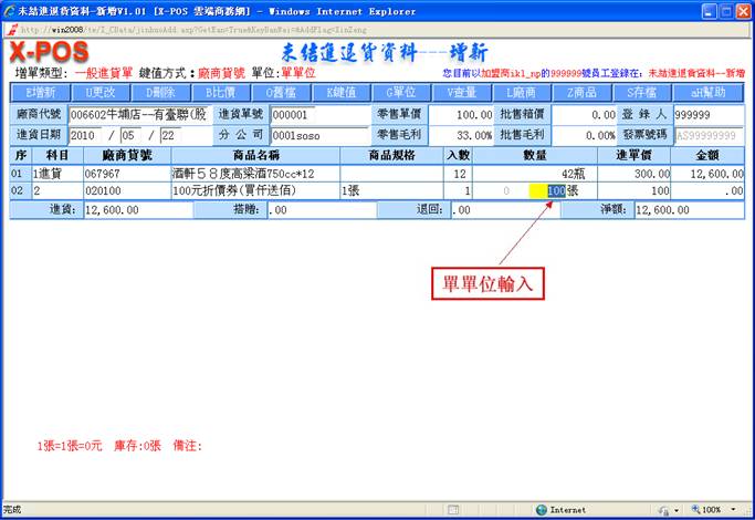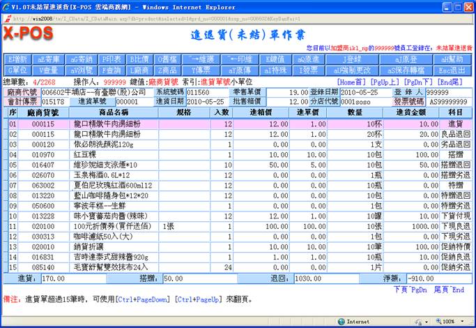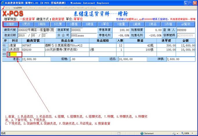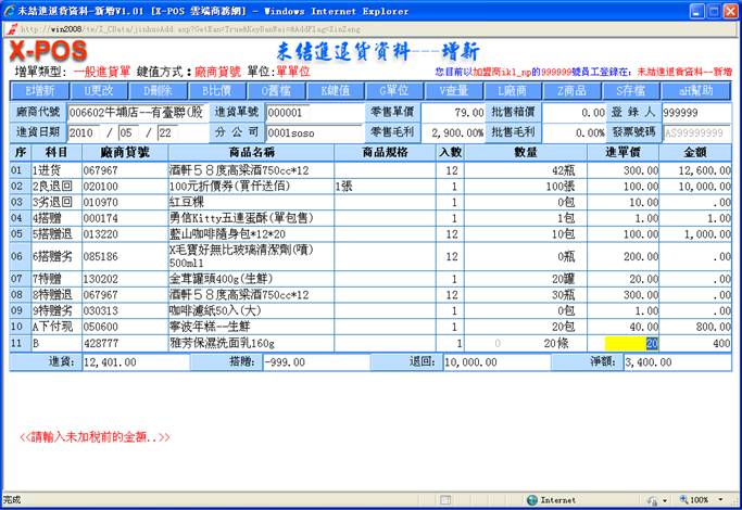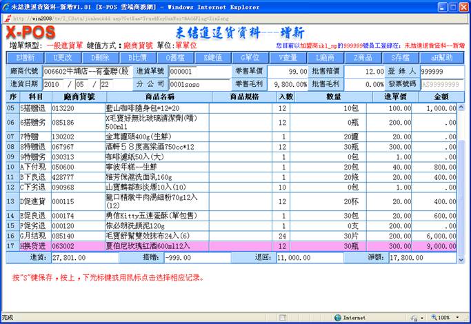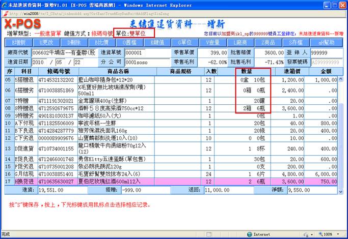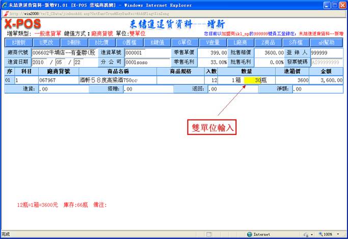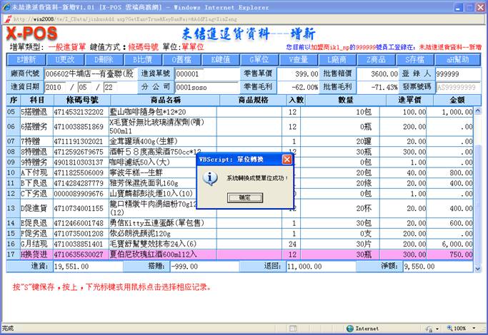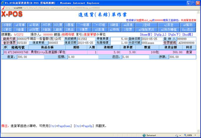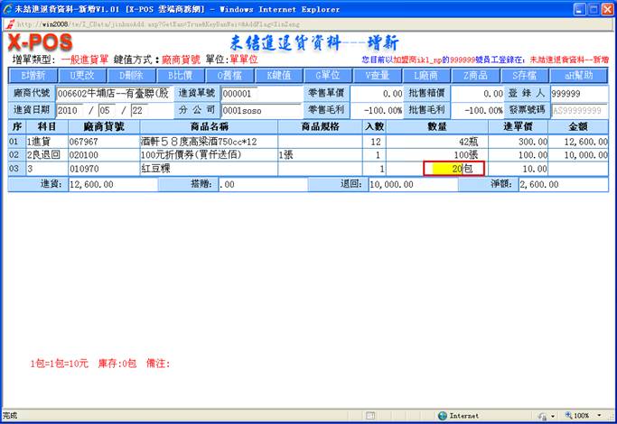 系统会去找出该商品母号相同条码的所有商品出来,再去比对其中是不是有本[厂商代号]的商品存在,存在的话就直接抓取该商品资料的相关内容转入进货作业中继续操作;但是万一一样的条码商品又建立有指定的厂商代号商品,可是该厂商代号的商品可能有一个以上时,系统并不会要求操作者选择使用哪一个厂商货号的商品,只是给于第一个找到的厂商代号的商品继续操作,因此有同样的条码商品又同一个厂商代号,但是必须建立二个不同厂商货号的商品资料这样的情况,那进货作业时就应该切换使用厂商货号的输入方式,直接指定输入该厂商货号商品即可。