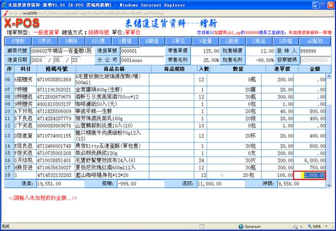 18-J>发票明细:有指定发票号码之进货单,将会将进货金额转入发票明细档中。但是执行本项财税同步功能时,一定需要进货金额与发票上的金额完全吻合。