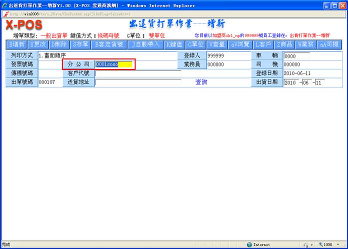 1-2. 出货分公司代号:若在分公司资料档案中设定有超过一家分店以上者,出货单输入时,如果登录操作系统的员工代号是设定为总公司人员,即可以指定该出货单的出货分公司代号,但是该操作员工设定为分公司的人员时,系统将预设为他所属的那家分公司代号,操作者不需要指定分公司代号。若是只有一家分公司资料时,系统将预设为第一家分公司代号,操作者不需要指定分公司代号。