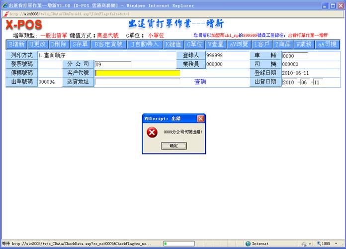 1-3. 如输入分公司代号:09, 不存在,则弹出提示框,单击