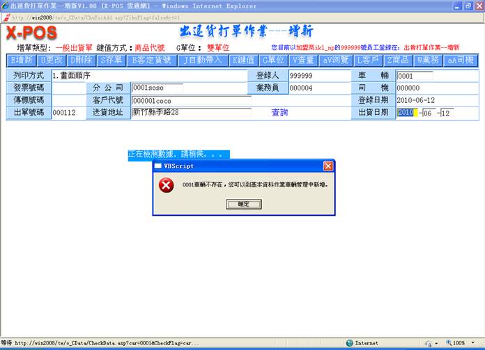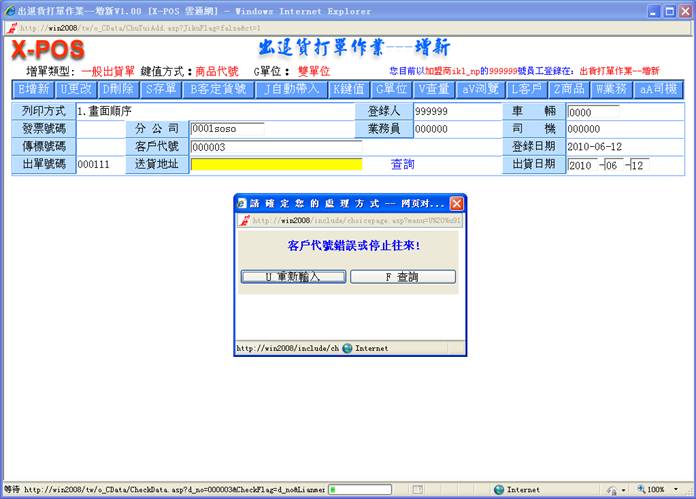 1-4.停止往来:客户资料中的交易情况设定为[X停止往来]者,选取出货客户要做采购作业时,系统将提出警告并禁止作业,这是因为如果已经有了出货单的存在,也就是有出货的事实,就必须先让操作者输入出货资料的考量。并且将停止所有报表列印功能。如果客户代号:007032,资料中交易情况:停止往来,那麼,在出货时系统将提出警告并禁止作业。