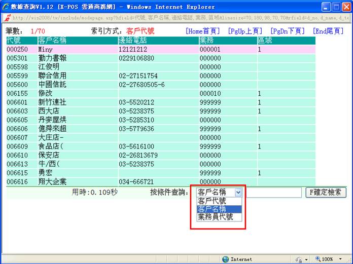 ,您将进入查询页面。在查询页面中,您可以先看当前页中,是否有您所需的客户,若有单击它即可;若无,您可以利用键盘上的