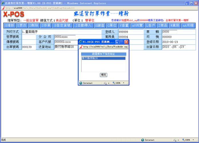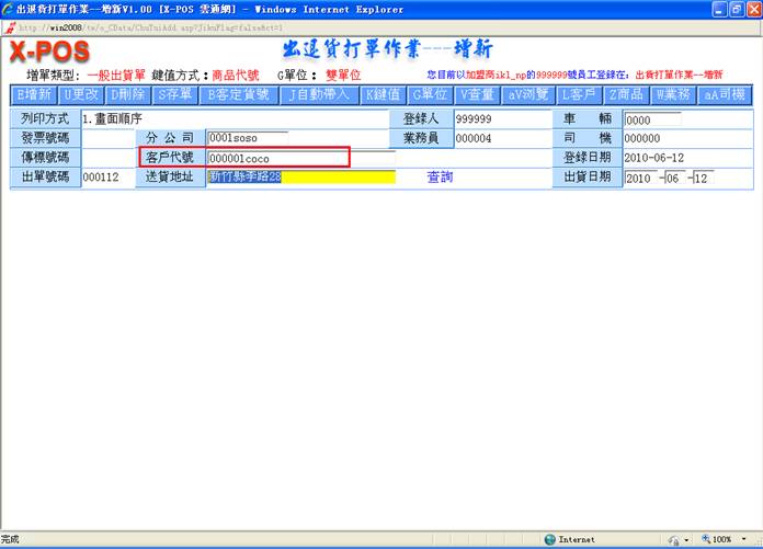1-8.送货地址:当您输入客户代号时,送货地址会自动显示:
