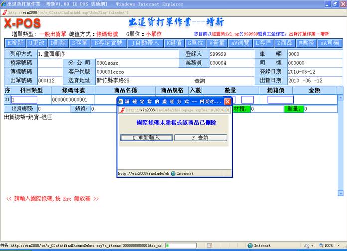 2-2. 国际条码输入方式:系统可以指定不使用商品代号的输入而切换使用国际条码(就是商品资料系统中的商品母号)来扫描做出货作业,如此可保证输入快捷并不发生人为输入代号错误的情况,一般都是使用在超市零售业的出货,或是五金、文具、饰品等等在包装上已经大量使用条码的商品最好用。不过使用这项输入方式的作业要特别注意一项细节,就是扫描条码以后系统会去找出该商品母号相同条码的母号商品(S_HOST=”+”)出来,再取得该母号商品的相对商品代号,利用该[客户代号+商品代号]去比对<客户批价资料档>D_SALE档案中是不是有本[客户代号+商品代号]的历史批价记录存在,存在的话就直接抓取该商品资料的相关批售内容转入出货作业中继续操作,但是万一一样的条码商品又建立有商品代号商品可能有一个以上时,系统并不会要求操作者选择使用哪一个商品代号的商品,只是给于第一个找到的母号商品相对的商品代号来继续操作,因此有同样的条码商品又多个商品代号这样的情况,那出货作业时就应该切换使用商品代号的输入方式,直接指定输入该商品代号商品即可。
