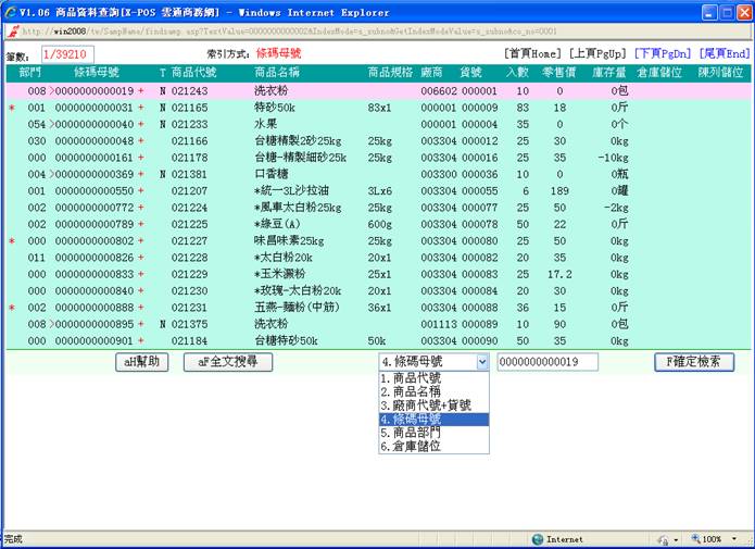 母号(条码)寻找可输入1>商品母号2>直输商品名称3>[/]强制查询4>输入问号-例如 [4710008?]