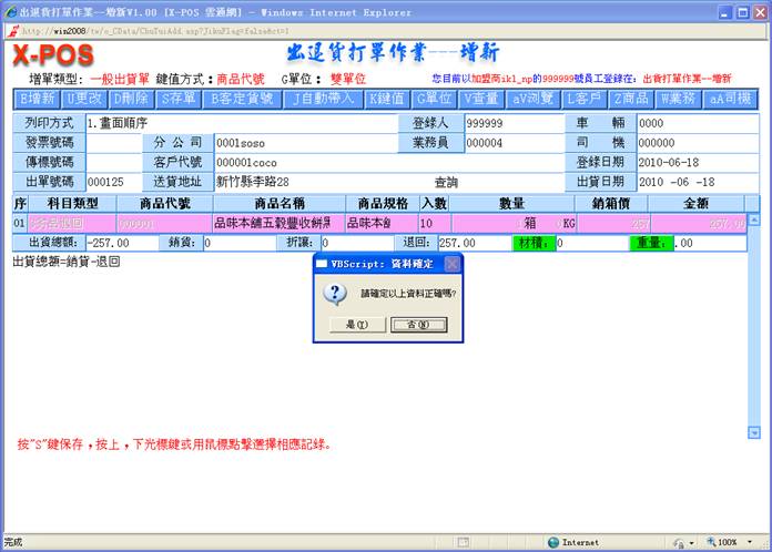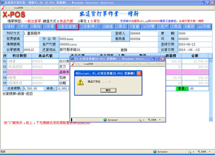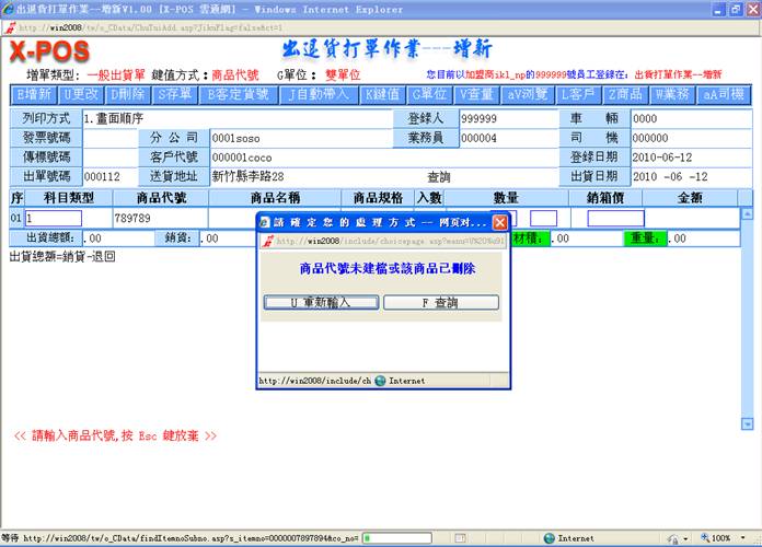 8-1.操作者使用国际条码(商品母号)输入出货商品,或是采用商品代号输入出货商品。当采用国际条码(商品母号)输入的方式时,系统会在输入的国际条码(商品母号)中找出是否存在有目前指定的商品资料,若是不存在就是表示该国际条码(商品母号)没有建立该商品资料,若是存在时且一个国际条码(商品母号)中,却建立有二个不同商品代号的资料时,系统永远只能抓取优先使用的母号商品(S_HOST=”+”)。若是键值指定使用商品代号输入,则输入的商品代号就是该客户的出货商品,将不去判断是否母号商品,但是当选择的商品代号商品资料是属于子号商品时(S_HOST=”-”),出货单上列印的商品规格内容将会是子号商品的规格文字,这种方式最适合的操作情况,是利用子号商品来区隔出很多的特殊商品出货,尤其像是奶粉类食品,同样的商品可是因为製造商的促销手法,每一次出货商品随著商品包装上的附赠品都不同,为了可以区别就必须利用子号商品出货的方式来达成。