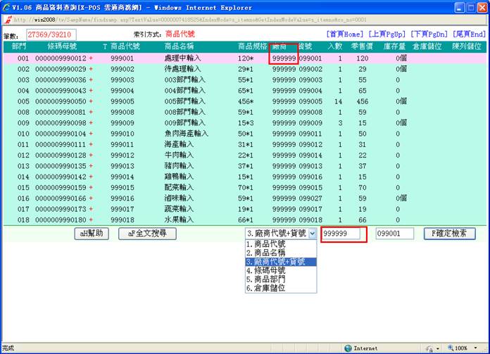 2-5. 系统会去找出该商品母号相同条码的所有商品出来,再去比对其中是不是有本[厂商代号]的商品存在,存在的话就直接抓取该商品资料的相关内容转入进货作业中继续操作;但是万一一样的条码商品又建立有指定的厂商代号商品,可是该厂商代号的商品可能有一个以上时,系统并不会要求操作者选择使用哪一个厂商货号的商品,只是给于第一个找到的厂商代号的商品继续操作,因此有同样的条码商品又同一个厂商代号,但是必须建立二个不同厂商货号的商品资料这样的情况,那进货作业时就应该切换使用厂商货号的输入方式,直接指定输入该厂商货号商品即可。