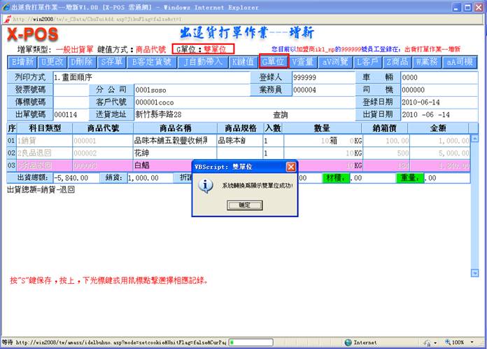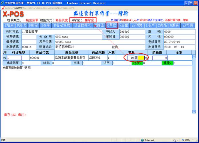 9-1. 系统允许作业中利用[G单位]快速切换键,来切换只显示小单位的总数量,或是显示大小单位自动换算的双单位显示模式,二种模式可以适合各式不同显示需求习惯的企业使用。