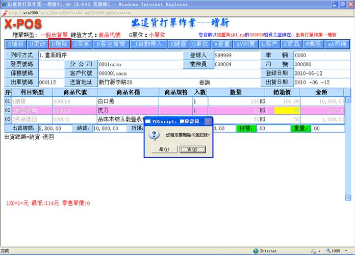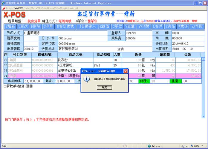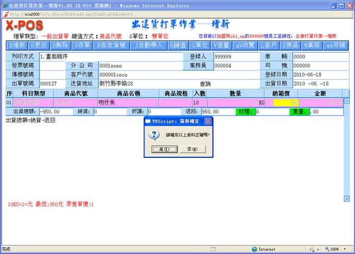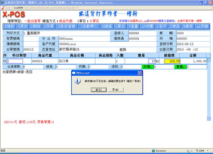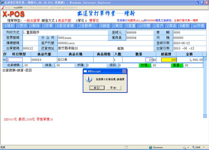 2-10.销箱价:填入你所要出货的商品的相关资料,当你所输入的批价小于最底价时,系统将会自动弹出警告窗口,点