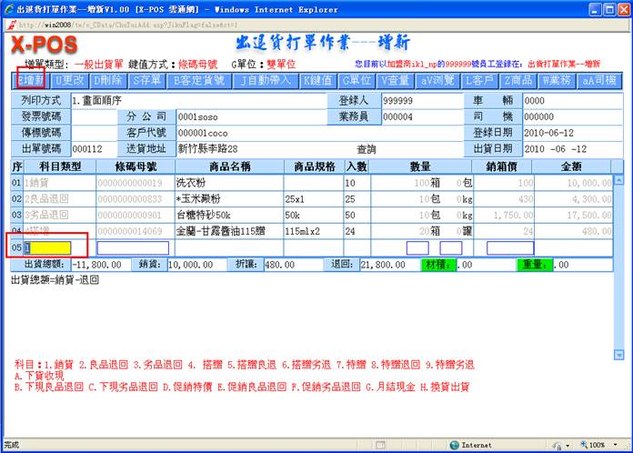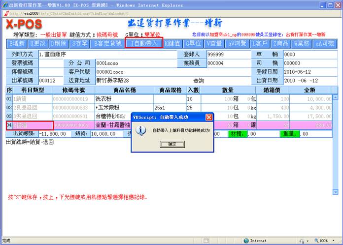 7-1.当啟动带入功能后.输入的科目将会自动带往下一个增新时参考使用,这样可以方便操作者连续输入相同出货科目时减少再次作科选择动作,对于天天需要大量输入出货单的使用者相当实用。点击