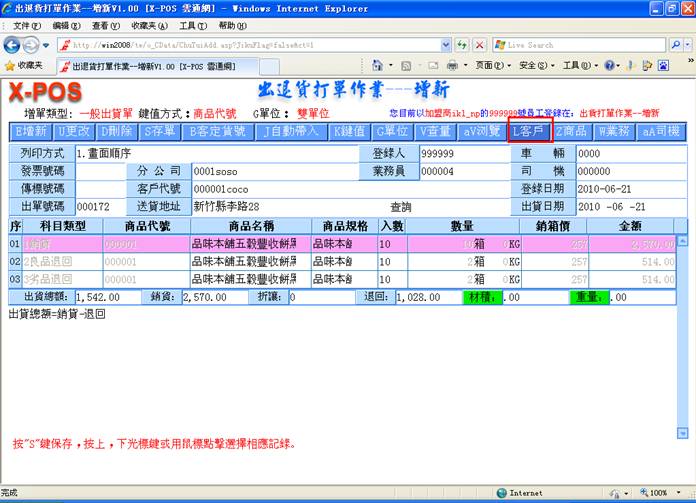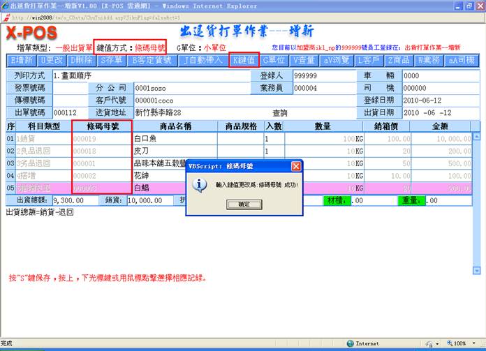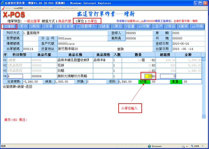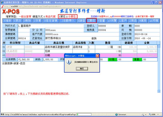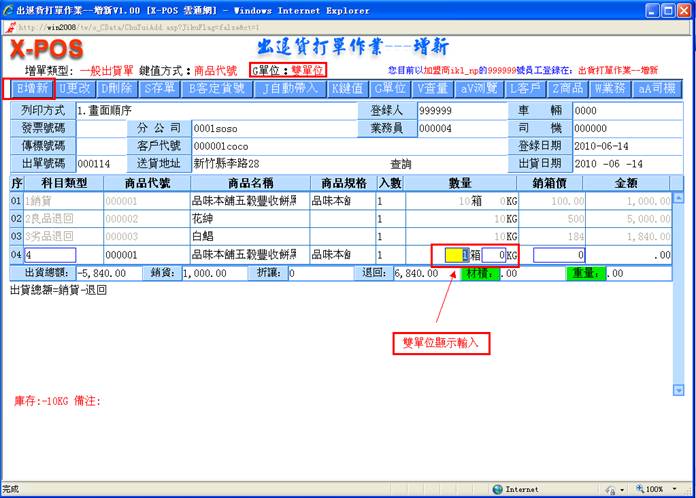 )快速切换键,来切换只显示小单位的总数量,或是显示大小单位自动换算的双单位元显示模式,二种模式可以适合各式不同显示需求习惯的企业使用,双单位例如:一箱为24罐输入10箱5罐、一打为12双输入4打6双、一斤为16两输入7斤8两等等;只输入单单位例如:120罐,6双,10两等等;输入出退货数量,按键盘上的
