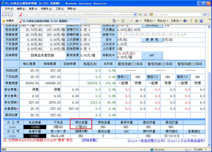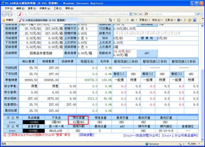 13-2.S存档之前,商品名称资料中,预出货量为:61箱0KG;