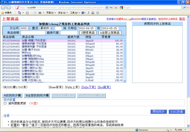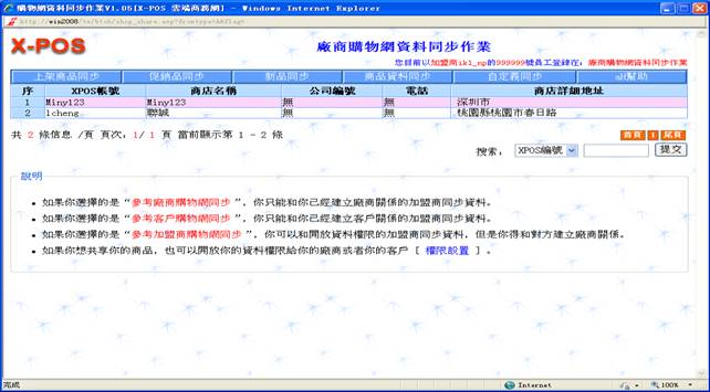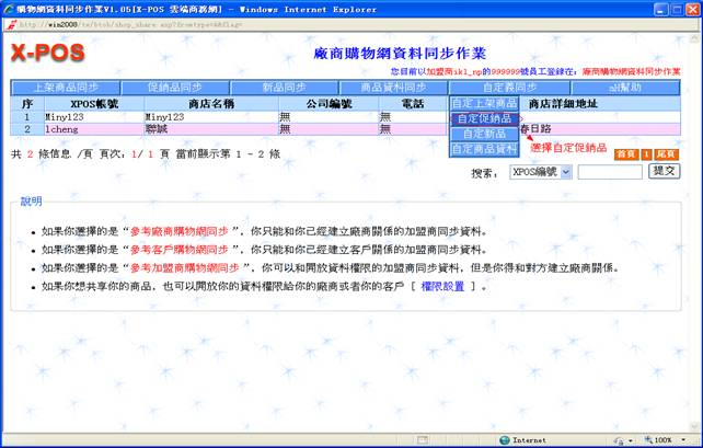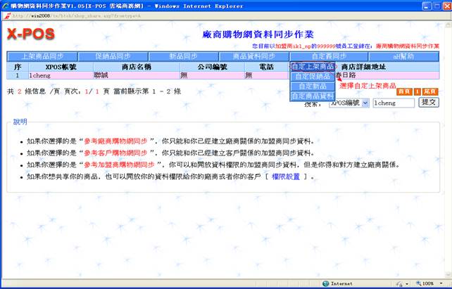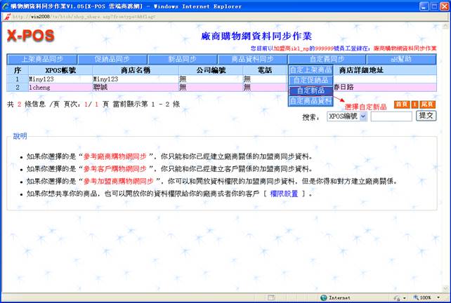 参考厂商购物网同步是你和你已经建立厂商关係的加盟商同步资料。目前包括上架商品同步、促销商品同步、新品同步、商品资料同步、自定义同步(自定上架商品、自定促销商品、自定新品、自定商品资料)。