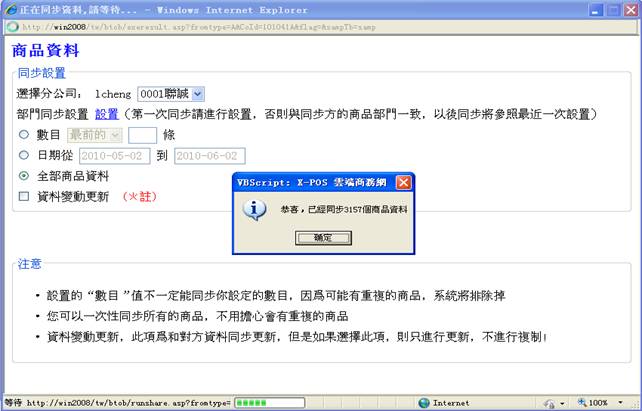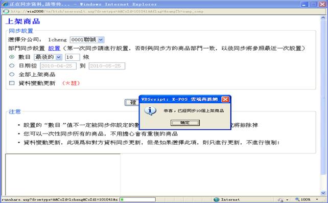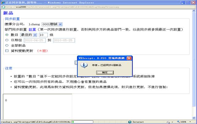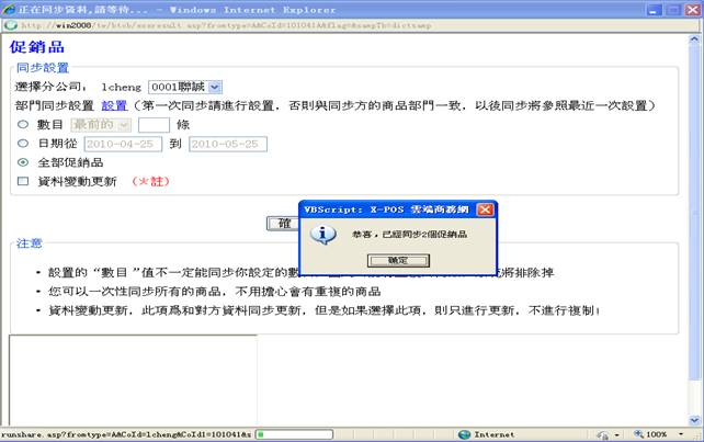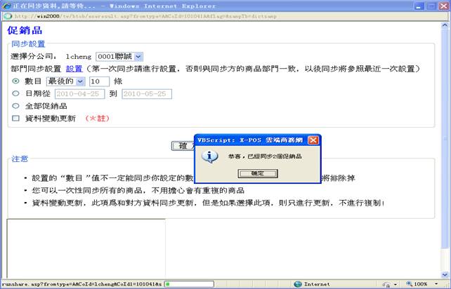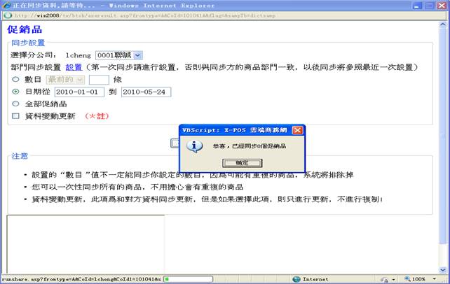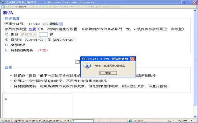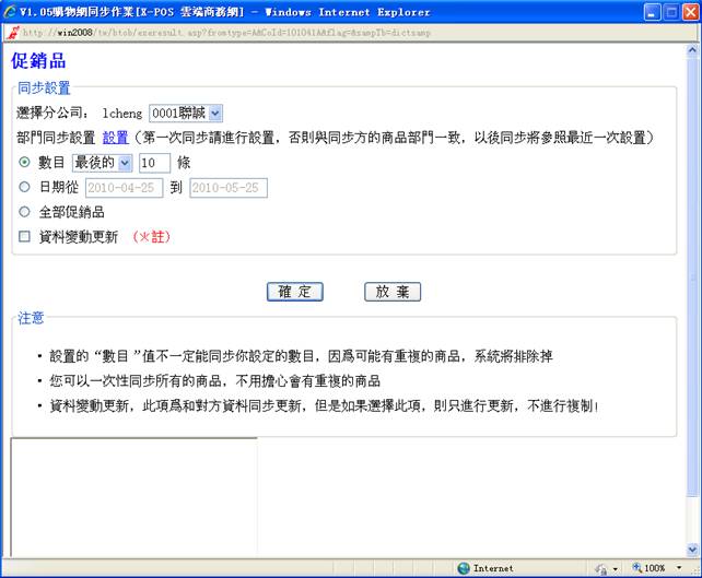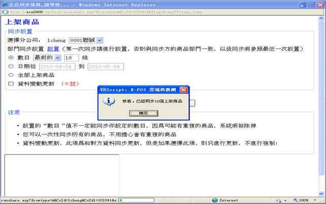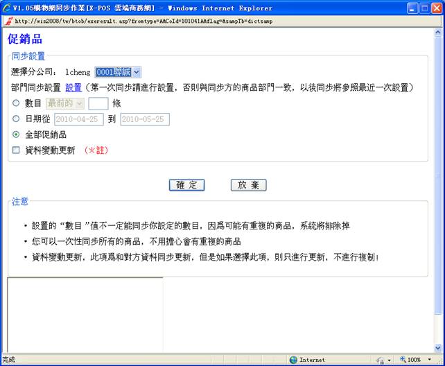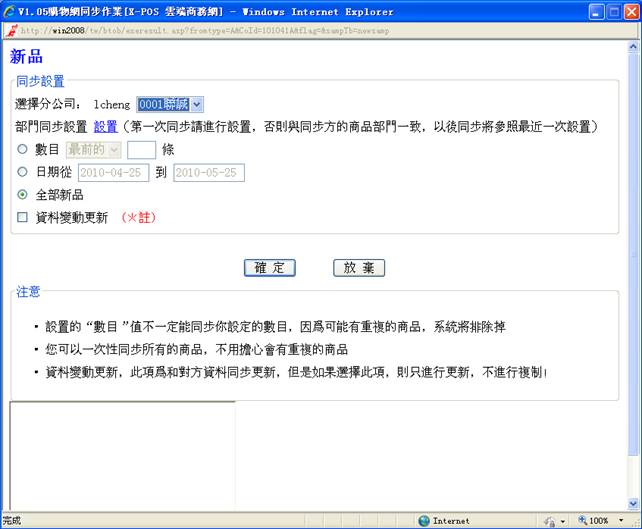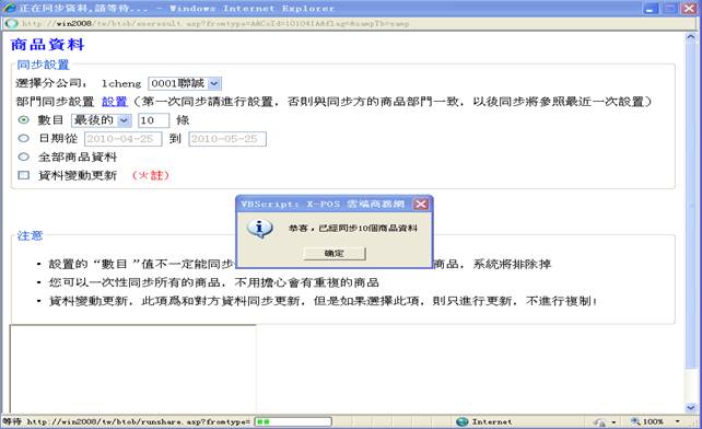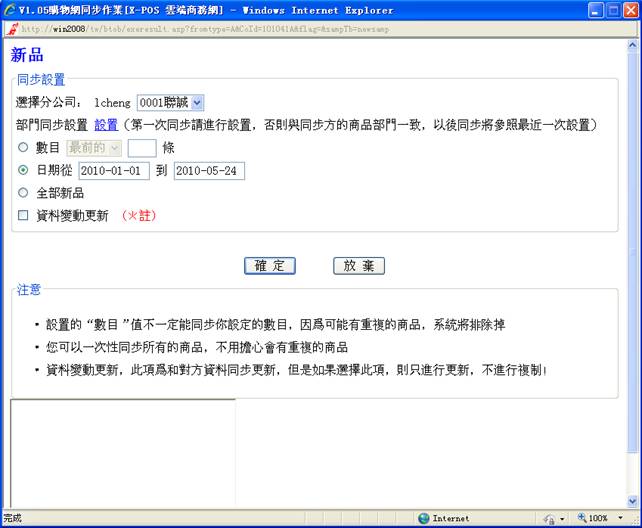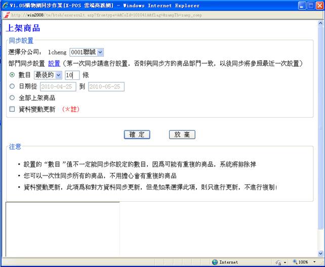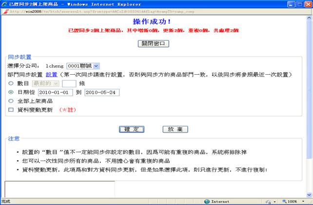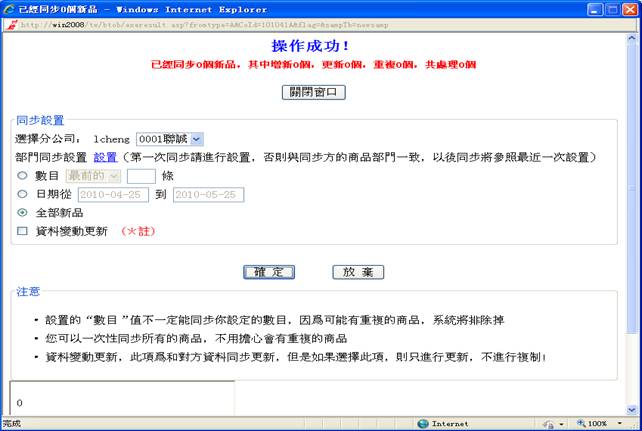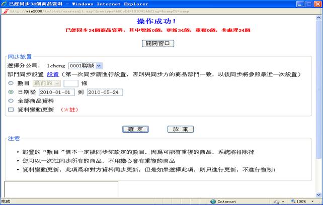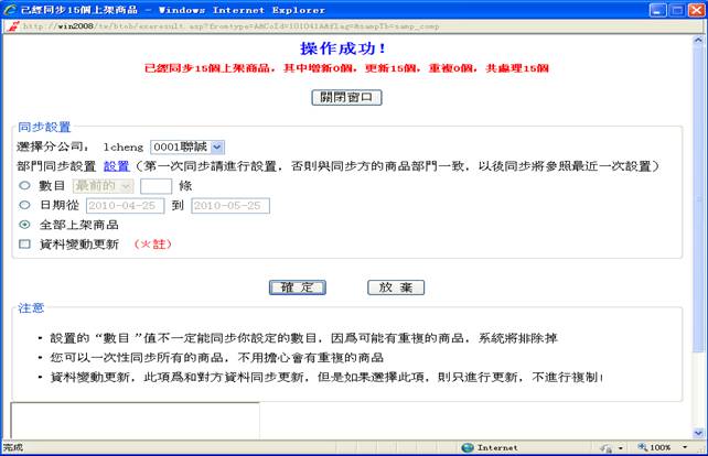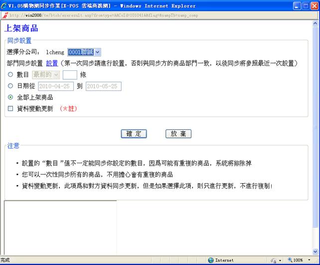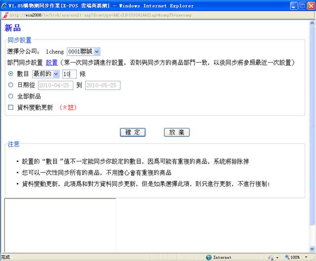 上图,选择分公司:您可以选择lcheng旗下的一所分公司;部门同步设置:数目,您可以选择同步最前的或最后的商品,再输入同步指定商品的条数;日期,您可以选择同步某段日期期间内的商品;全部商品资料,同步所有商品资料。(更多信息看页面的注意事项)