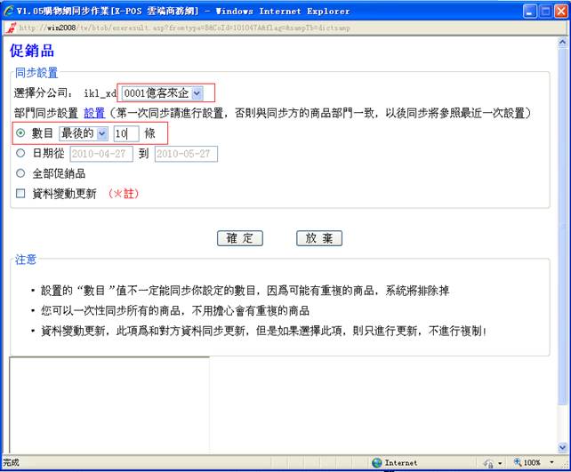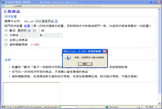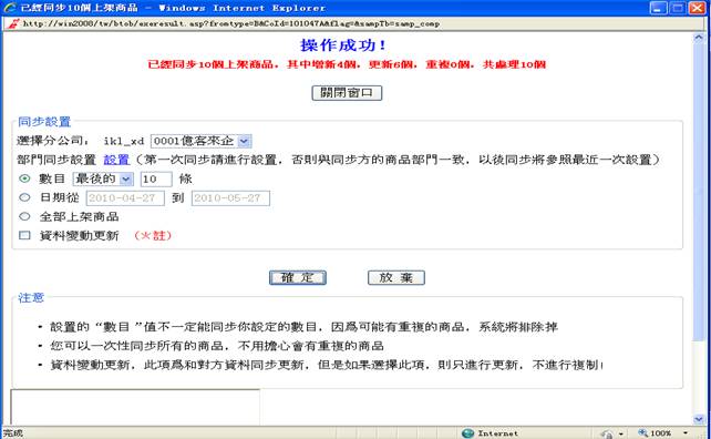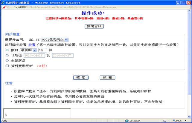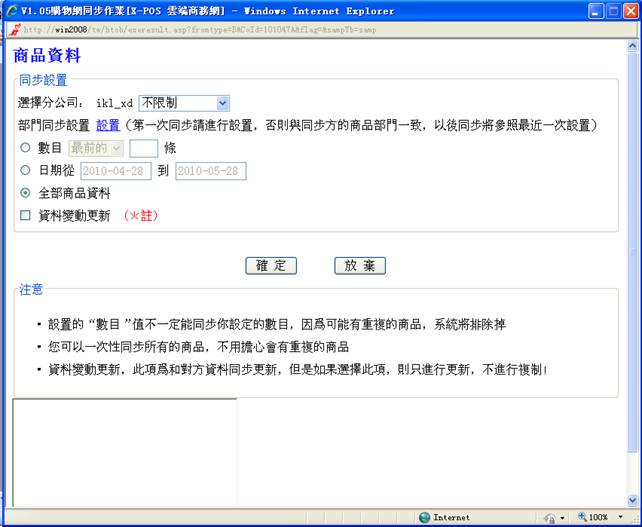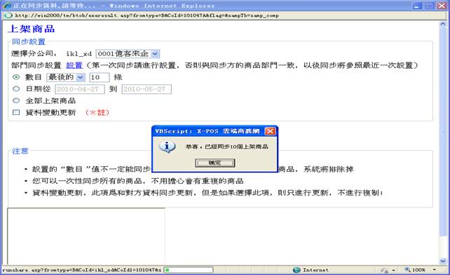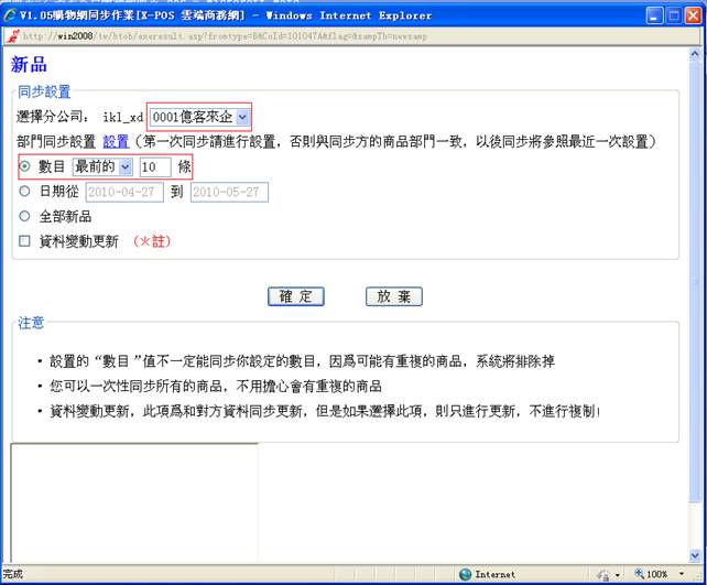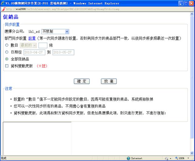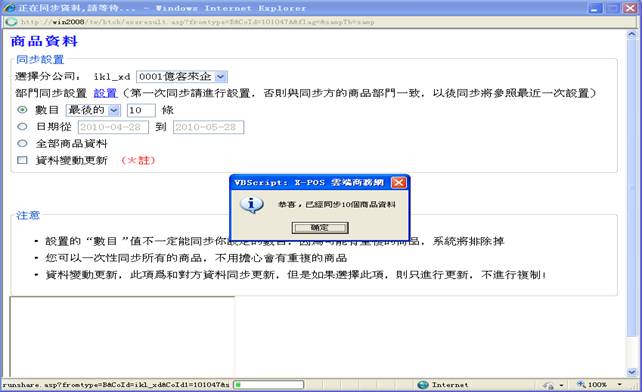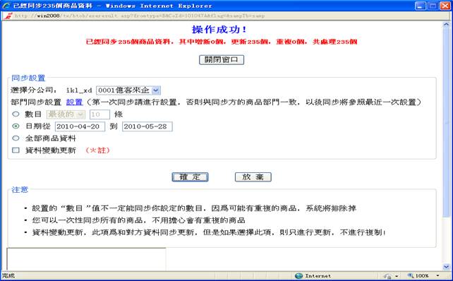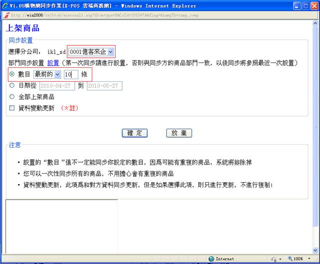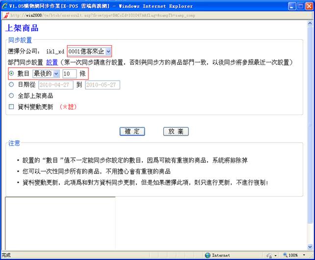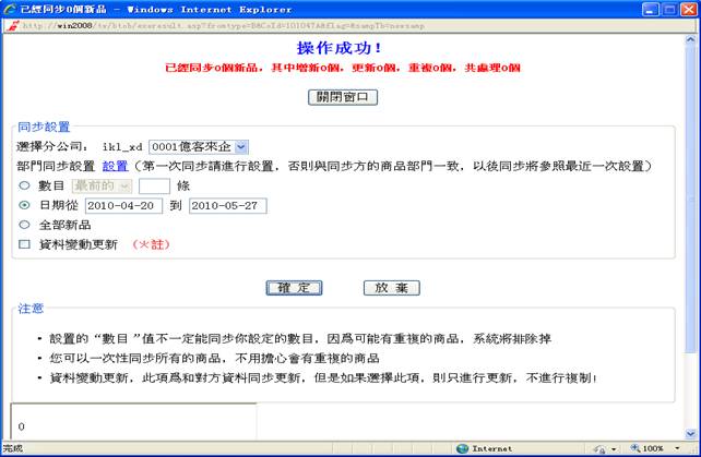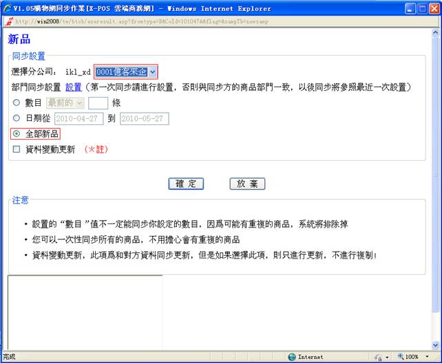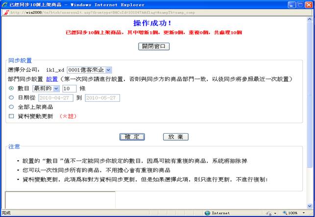 上图,选择分公司:您可以选择ikl_xd旗下的一所分公司;部门同步设置:数目,您可以选择同步最前的或最后的商品,再输入同步指定商品的条数;日期,您可以选择同步某段日期期间内的商品;全部商品资料,同步所有商品资料。(更多信息看页面的注意事项)