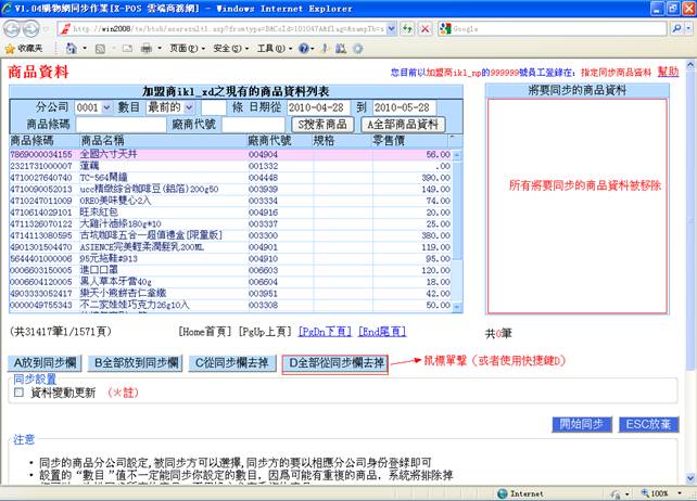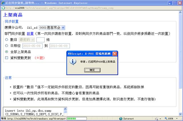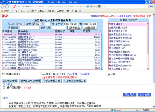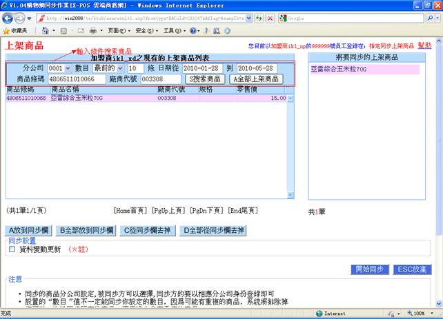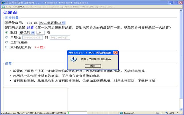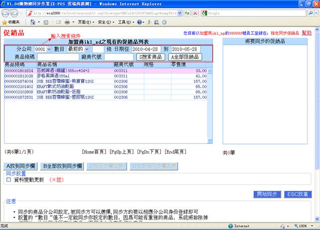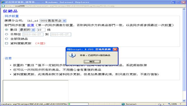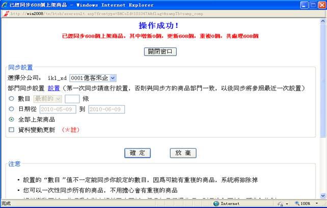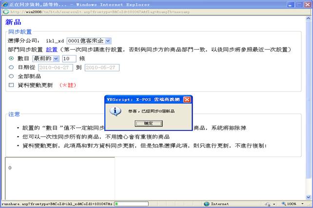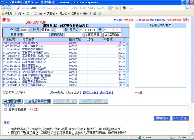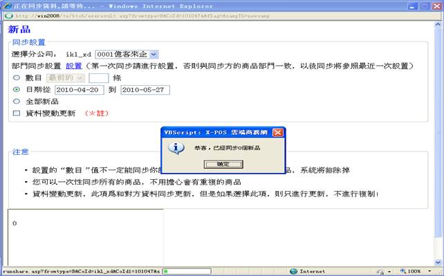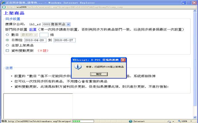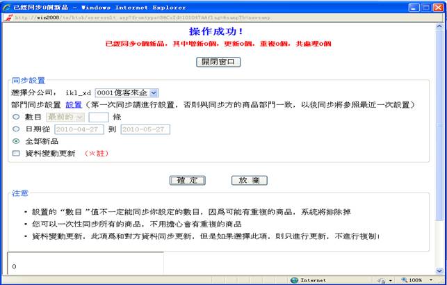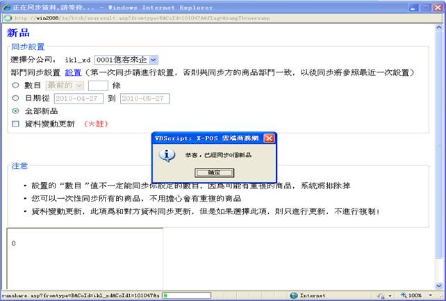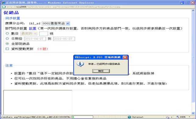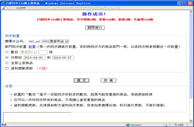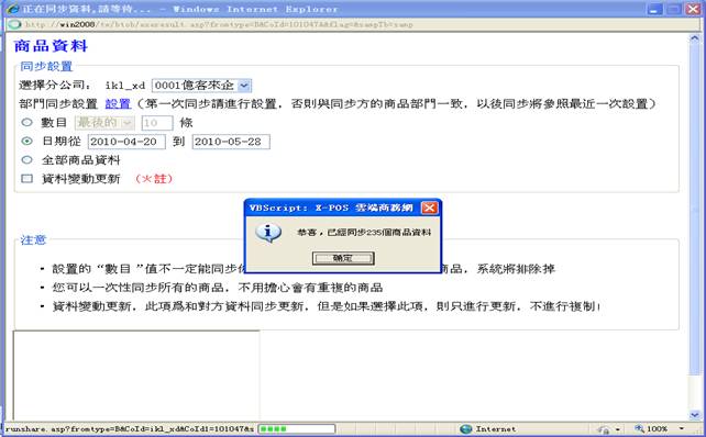 上图,选择分公司:您可以选择ikl_xd旗下的一所分公司;部门同步设置:数目,您可以选择同步最前的或最后的商品,再输入同步指定商品的条数;日期,您可以选择同步某段日期期间内的商品;全部商品资料,同步所有商品资料。(更多信息看页面的注意事项)