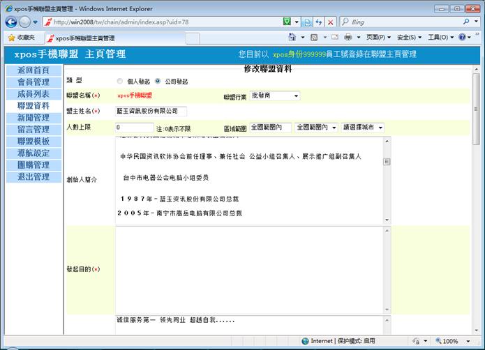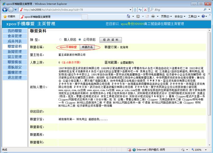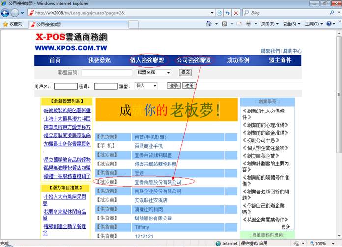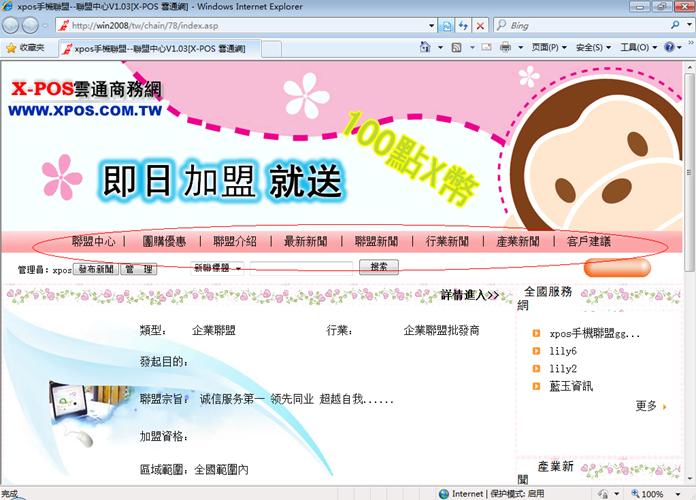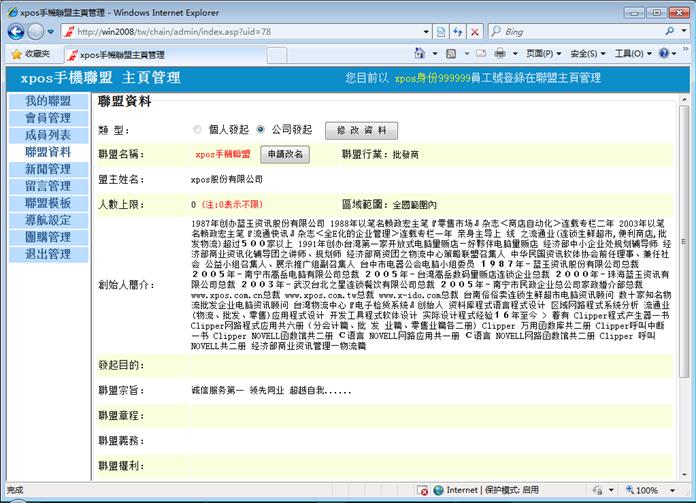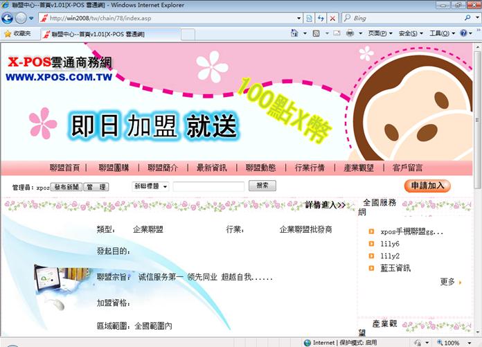 X-POS联盟中心就是X-POS网络平台系统,为让弱势的小企业可以透过加盟的方式,让自己的同业或是异业作结合,产生更大的营销组织效益,增加营销的范围与服务对象。就好像是一家小花店可以结合全国一样的小花店,变成全国性的服务网,这样才可以争取到更多的客户群。一家小小的餐厅也可以结合相同菜色的餐厅,联盟成为一个全市或全省的外卖服务网呢!一个小手机批发商也可以利用联盟中心,建构出全国性的销售与维修服务网呢!只要有野心的企业都可以利用联盟中心扩大自己的营销领域的。