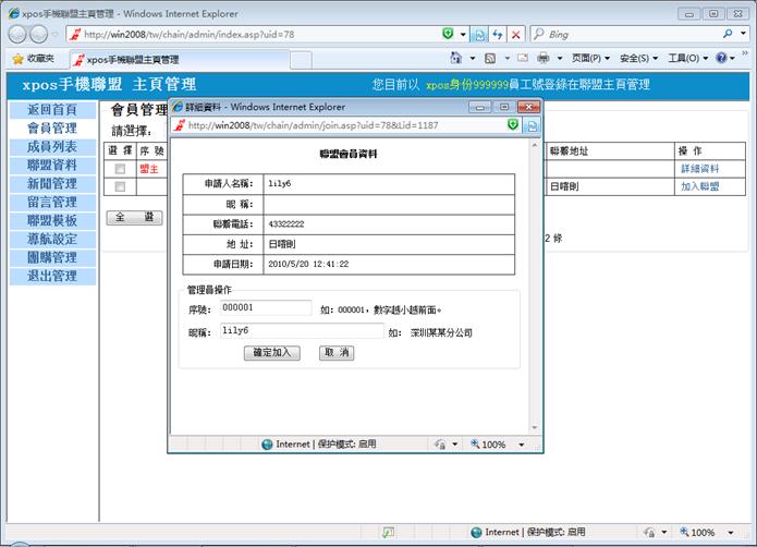 如果有会员申请加入您的联盟,您可以在会员管理处查看该会员的信息,并决定是否允许该会员加入。如果允许该会员的加盟,则点击