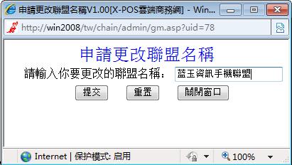 ==》在弹出来的对话框中填入你想更改的联盟名称按提交即可,X-POS后台管理人员会根据你的情况帮你更改联盟名称。注意:全站的联盟名称是唯一的。