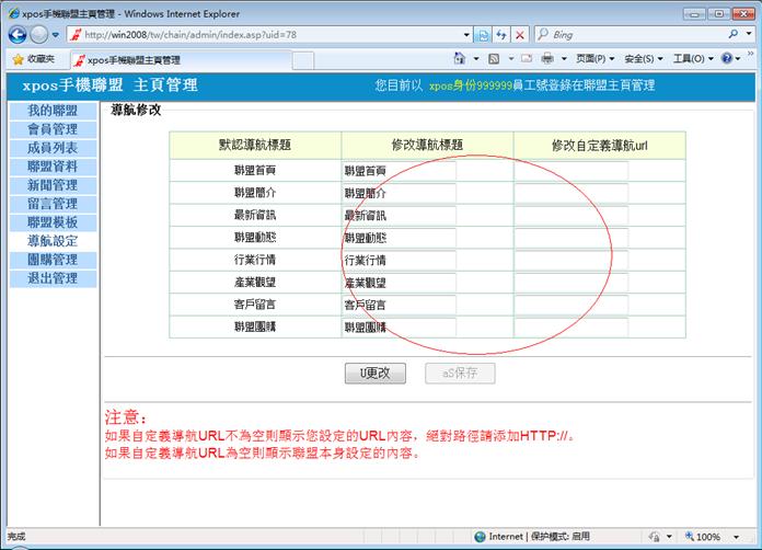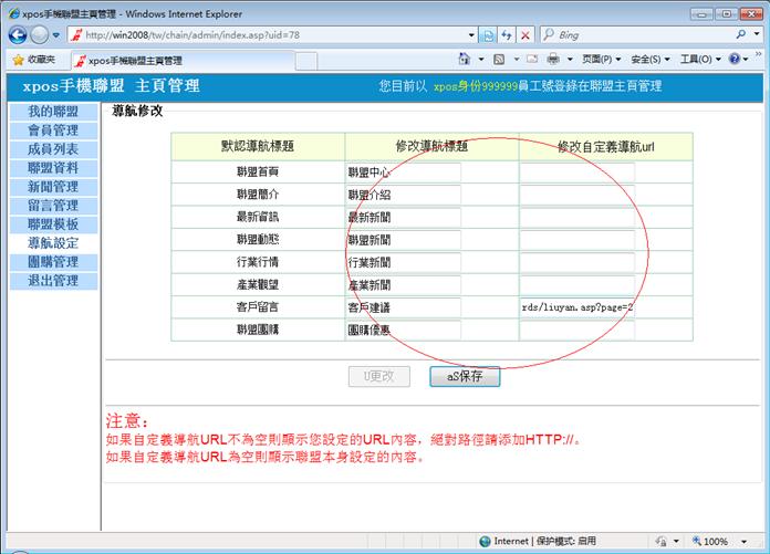 更改“导航设定”可更改联盟中心的导航名字和自定义导航的链接地址,