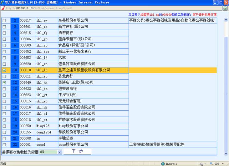 3-A-1选择 收集库存资料,弹出往来中的客户列表,选中您想要收集的客户后点选“下一步”。