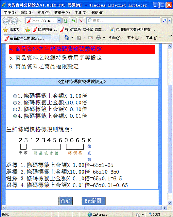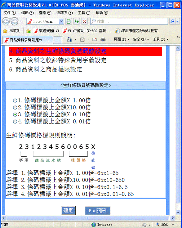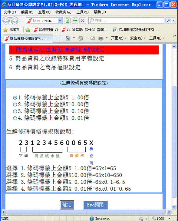按鈕確定輸入,用戶可仔細查看裡面的說明(選擇1:條碼標簽上的金額*1倍、選擇2:條碼標簽上的金額*10倍、選擇3:條碼標簽上的金額*0.1倍和選擇4:條碼標簽上的金額*0.01倍,在此需要注意的是,此類設定需重新啟動X-POS頁面才能更方便您使用):