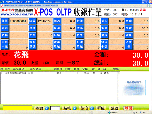 4-11、以下是完成上步操作后的X-POS收銀界面,可見頁面上已顯示“花飛”條碼母號已改為2301100603008、價格已變動為30元(30元*1.00倍),“23字手動價格標”操作成功!: