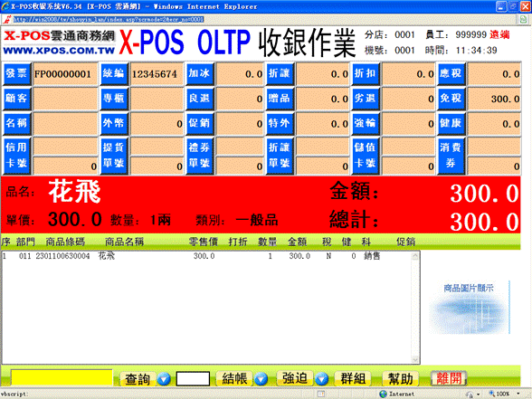 4-12-3、以下是完成上步輸入后的X-POS頁面,可見頁面上已顯示“花飛”條碼母號已改為23011006030004、價格已變動為300元(30元*10倍),“23字手動價格標”操作成功!