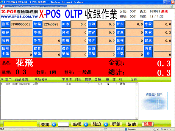 4-14-2、以下是完成上步操作后的X-POS收銀界面,可見頁面上已顯示“花飛”條碼母號已改為2301100600038、價格已變動為0.3元(30元*0.01倍),“23字手動價格標”操作成功!