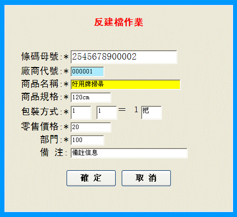 6-5、輸入“W”后彈出以下進入反建檔作業輸入框,用戶可在裡面輸入商品資料(如將商品名稱設定為“好用牌掃帚”、零售價格為“20元”等),商品輸入完成后點擊