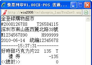 以上對話框所顯示:總計金額0元、收現0元和找零0元;發票列印顯示:操作員工號999999、統編:12345678、禮券卡支付135元,禮券卡支付成功!