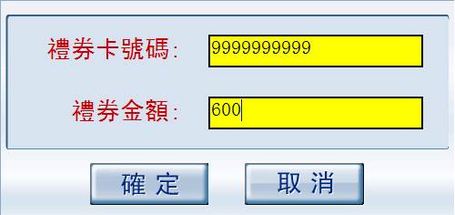 2-7-2、完成上步操作后系統彈出以下對話框,用戶只需在裡面輸入禮券卡號和金額600元即可點擊