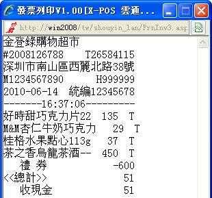 以上對話框所顯示:總計金額:51元、收現51元和找零0元;發票列印中顯示:操作員工號999999、統編12345678、禮券卡支付600元和現金支付51元。禮券卡與現金同時支付成功!
