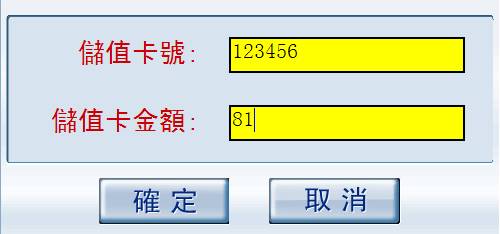 6-2、完成上步操作后,系統彈出以下對話框,用戶只需在裡面輸入顧客出示的儲值卡號和金額並按