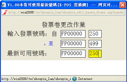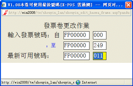 當收銀機發票卷用完,用此功能可以設定發票卷自動往一個新的號碼開始,例如尾數號碼為000-249之間的發票卷號碼用完后,你可以重新設定換卷從249-499號碼開始,或也可以強制更改使用其它的發票卷號碼。系統預設的發票卷是每一千號分四卷,有000~249,250~499,500~749,750~999。