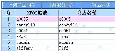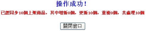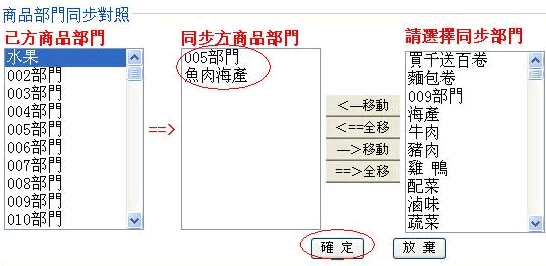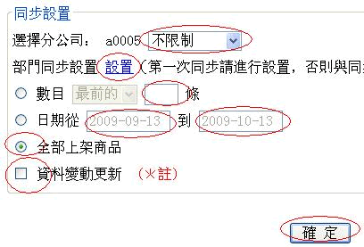 圖① 1.選擇分公司:選擇你要的分公司,如圖① 2.部門同步設置:點擊“設置”如圖①會彈出如下窗口,設定您要同步的部門,按“確定”完成設定,如下圖: 3.數目:設置的“數目”值不一定能同步你設定的數目,因爲可能有重複的商品,系統將排除掉 4.日期:格式2009-09-13,如圖① 5.全部上架商品:一次性同步所有的商品,不用擔心會有重複的商品,如圖① 6.資料變動更新:此項和對方資料同步更新,但是如果選擇此項,則只進行更新,不進行複制!,如圖① 7.點擊確定同步,如圖: