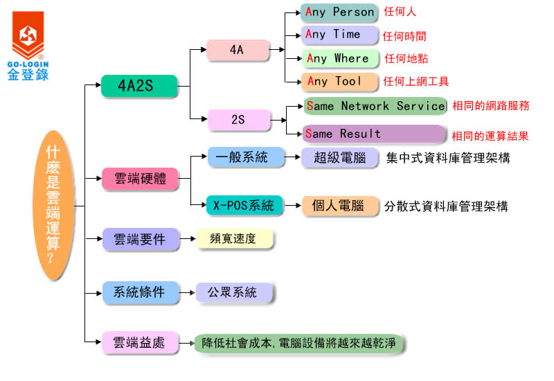 为了能更简单的明瞭云端运算,笔者给他一个简单易懂的说法,符合云端运算条件要有”4A2S”的基本要件,那就是任何人(Any Person)、任何时间(Any Time)、任何地点(Any Where)、使用任何工具上网(Any Tool)、你都可以得到相同的网路服务(Same Network Service),并且得到相同的结果(Same Result)。条件一:要达到任何人都可以使用,这就表示应该是类似公开的网路公眾系统,就是不是完全公开也要透过简单的注册手续后(例如会员制须注册后才可以登陆使用),即可以登录使用所提供的云端网路服务。条件二:要能任何时间都能提供服本就网路世界的特性,只要频宽不断、主机不停机,网路世界本就是24小时服务的世界。条件三:任何地点在现在的大环境下,不只是平常的宽频上网,更利用简单的AP无线发射器既能支持内部无线上网的WIFI系统,当然餐饮业也有利用这样简单硬体